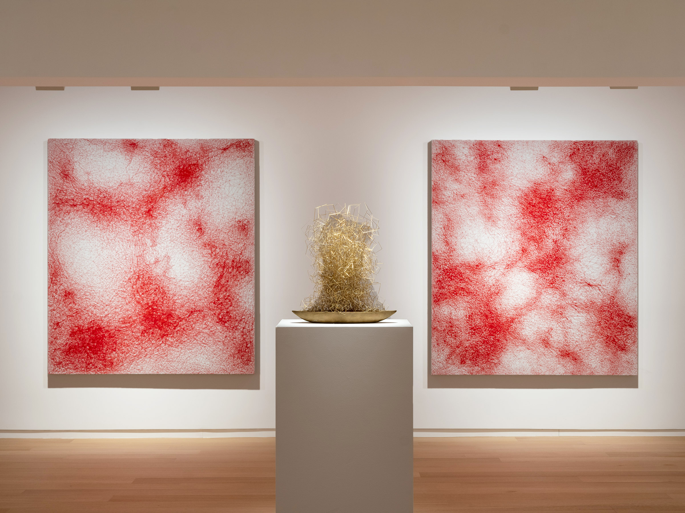 After a foundation degree in painting at Seika University in Kyoto, Chiharu Shiota chose to pursue her artistic studies in Berlin, focusing on performance. Her practice soon shifted towards site-specific installations. She skilfully weaves knotted threads to create fantastical scenes combining salvaged window frames, a piano, suitcases, books and used clothes. Bordering on drawing and sculpture, her fabulous ephemeral, immersive installations have become her signature. Since her impressive installation for the Japanese Pavilion at the Venice Bienniale in 2015, she has become one of the key figures on the international art scene and is regularly invited to show her work at museums worldwide.